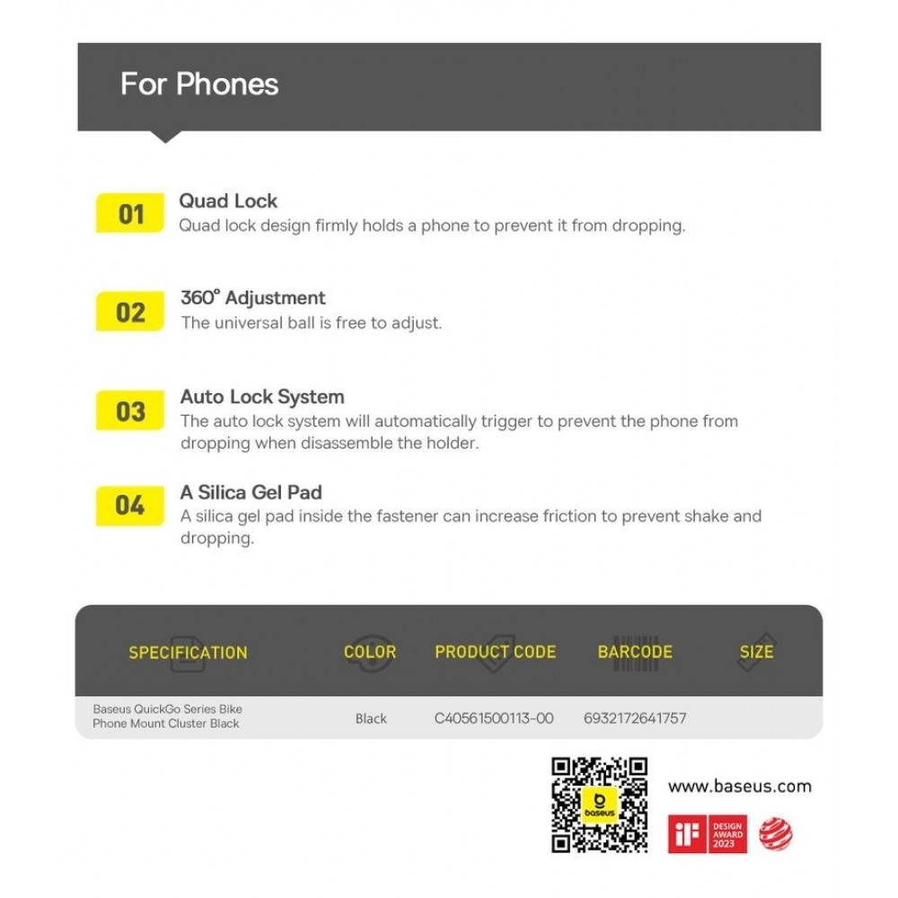 „Baseus“ dviračio laikiklis užtikrina stabilų palaikymą ir išskirtinį komfortą jūsų išmaniajam telefonui važiavimo metu. Patobulintas galinis spaustukas pašalina vibraciją ir drebėjimą, užtikrindamas didesnį stabilumą net ir nelygiuose keliuose. Ištraukiamos spaustuko rankenėlės sukurtos saugiam laikymui ir lengvam naudojimui. Specialus jungiklis užfiksuoja spaustukus, kai jie priveržti, užtikrindamas, kad jūsų išmanusis telefonas liktų vietoje. Šie pagalvėlės pagerina sukibimą, neleisdamos jūsų išmaniajam telefonui slysti važiavimo metu. Laikiklį galima sumontuoti vos trimis paprastais žingsniais, todėl jis yra praktiškas ir patogus naudoti. Sukant telefoną 360° kampu, galite jį pastatyti tiek vertikaliai, tiek horizontaliai, todėl bet kokioje situacijoje gausite tobulą matymo kampą. Tinka telefonams, kurių įstrižainė yra nuo 5,7 iki 7,2 colio, todėl telpa daugybė įrenginių. Laikiklio universalumas leidžia jį tvirtinti ne tik ant dviračių, bet ir ant motociklų, motorolerių ir net vaikiškų vežimėlių, todėl tai praktiškas sprendimas įvairioms transporto rūšims. „Baseus“ dviračio laikiklis sujungia stabilumą, naudojimo paprastumą ir universalumą, todėl tai idealus pasirinkimas bet kuriam dviratininkui ar vairuotojui, ieškančiam patikimo telefono laikiklio.