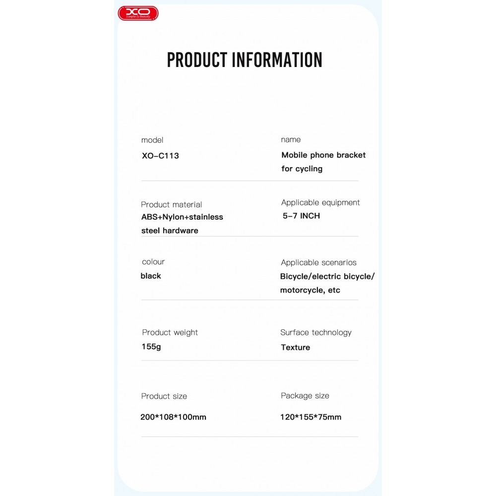 XO C113 yra universalus išmaniojo telefono laikiklis su laikikliu ant vairo, tinkantis dviračiams ir motociklams. Speciali konstrukcija saugiai laiko išmanųjį telefoną stabilioje padėtyje.